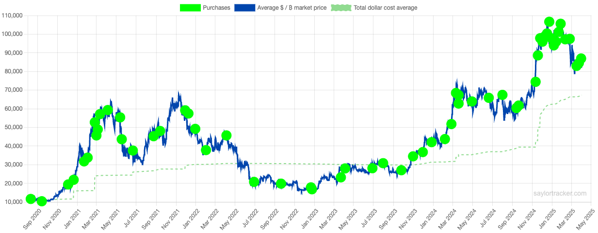 MicroStrategy remained relentless, acquiring over 29,000 BTC in March alone. Their total Bitcoin holdings now exceed 528,000 BTC (~$45.2B), with an average purchase price of $67,485.