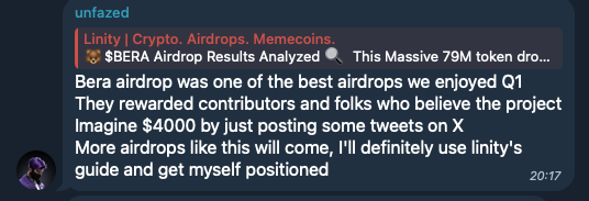 "Bera airdrop was one of the best airdrops we enjoyed in Q1. They rewarded contributors and folks who believe in the project. Imagine $4000 by just posting some tweets on X. More airdrops like this will come, I'll definitely use Linity's guide and get myself positioned."