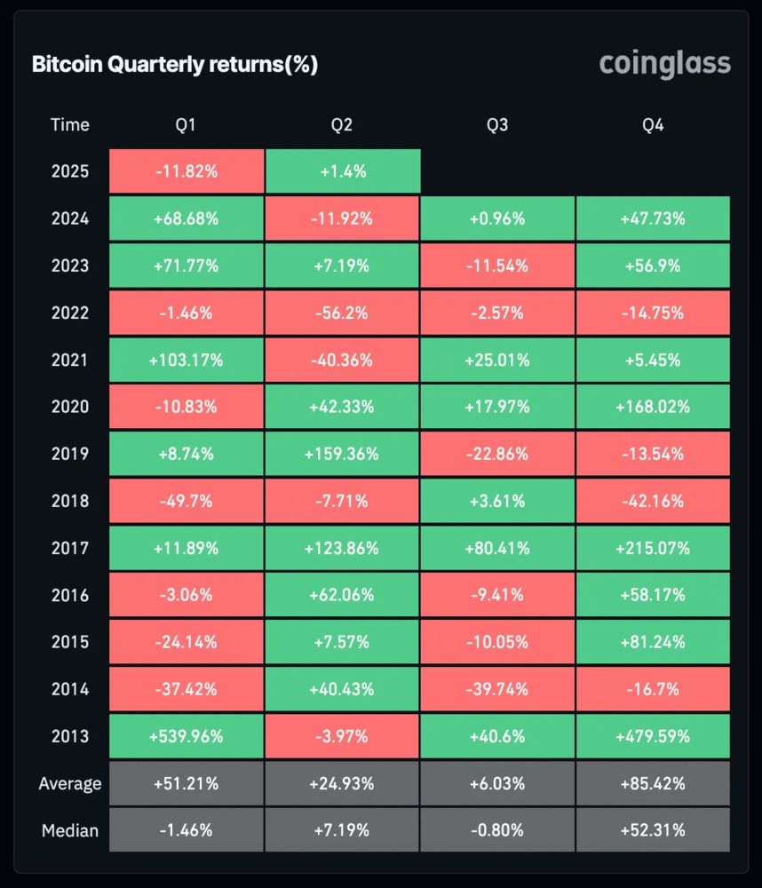 BTC had a ~12% turndown this quarter, making it the worst Q1 performance since 2018. Take a look: