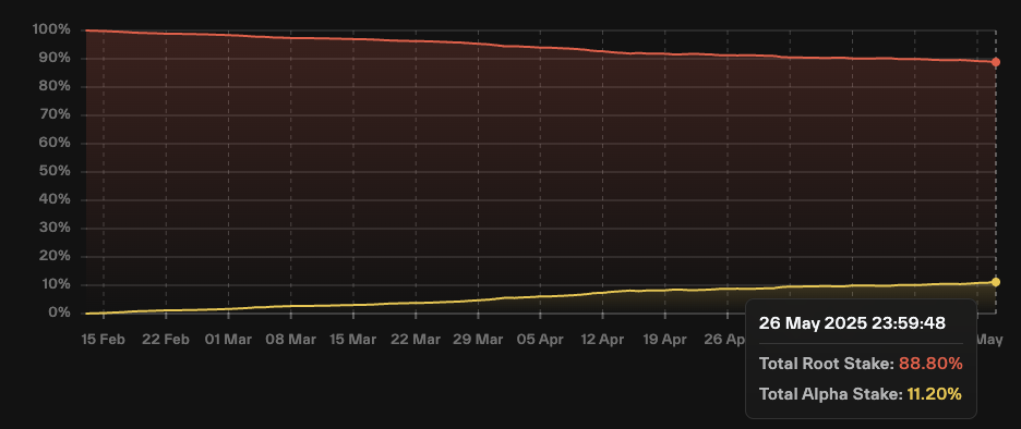 In Root staking, staking rewards are simple and “stable”. However, the reward amount (APY) is slowly going down over time. It’s because the network is moving more rewards toward Alpha staking.