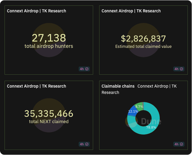 In total Connext airdrop has received 27,138 users and has claimed 33,335,466 NEXT tokens.