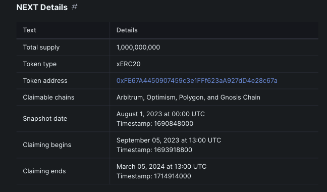 Snapshot was taken August 1, 2023 at 00:00 UTC, users started claim rewards at September 05, 2023 at 13:00 UTC in Arbitrum, Optimism, Polygon, and Gnosis Chain.