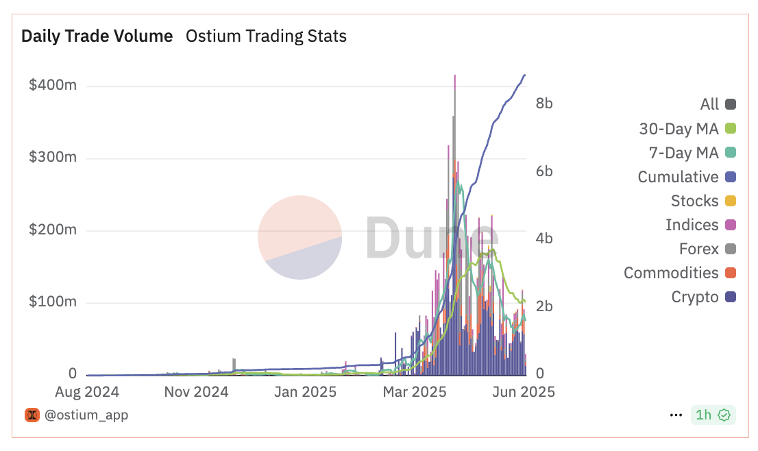 The Dune dashboard shows that Ostium's trading and vault stats on Arbitrum reached $8.9B in total volume by June 3, 2025. Almost 9,000 users have traded, generating total fees of $3.6M. Part of this amount goes to Market Making Vault depositors, as detailed in the Ostium Documentation).Source: Dune