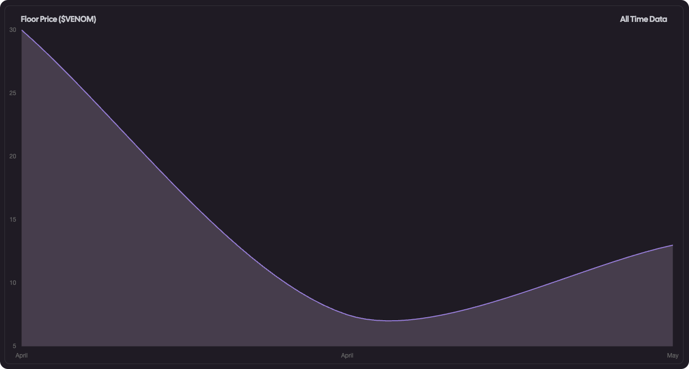 After a month, the floor price of the NFT dropped to 10 Venom tokens, and the price of Venom tokens fell to $0.30. This means that if you sold the NFT at that point, the reward would be only $3.