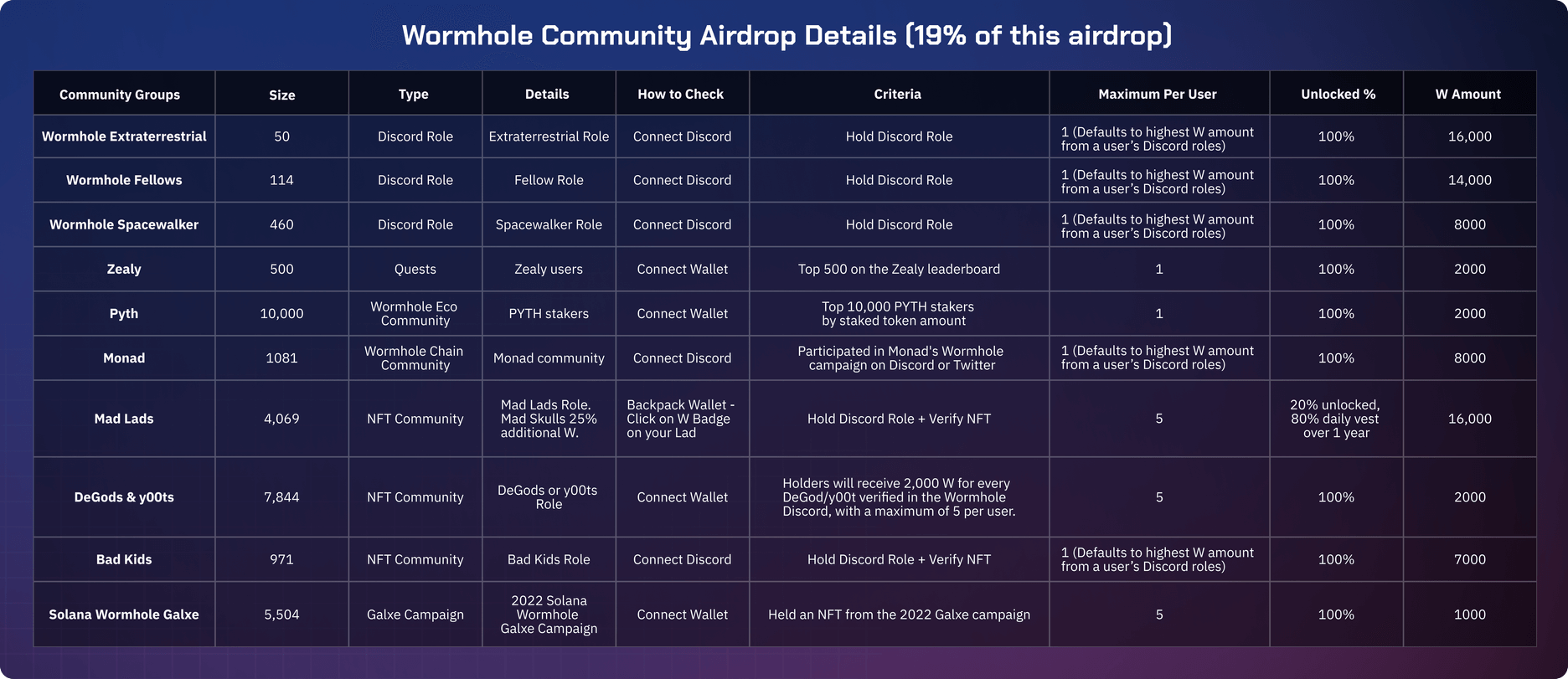 - NFT Holders: Holders of DeGods, y00ts, Bad Kids, and Mad Lads NFTs who participated in community events and utilized Wormhole for transactions were eligible.