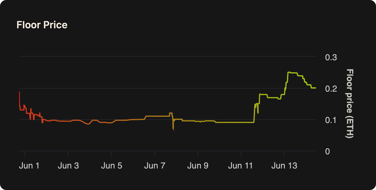 The mint price was 0.087 ETH, which equates to approximately $150 given the current ETH market price of $1740. After the launch, the NFT price stagnated for a while for it to then triple, with the average sale price now hovering around 0.24 ETH or approximately $420.