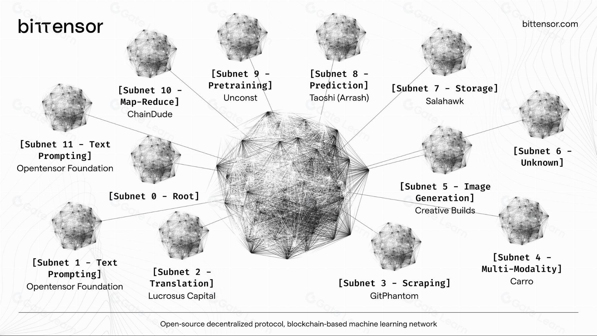 The network is organized into specialized subnets, each focused on a specific AI task. This structure allows Bittensor to scale as a collection of expert AI services, all working in parallel.