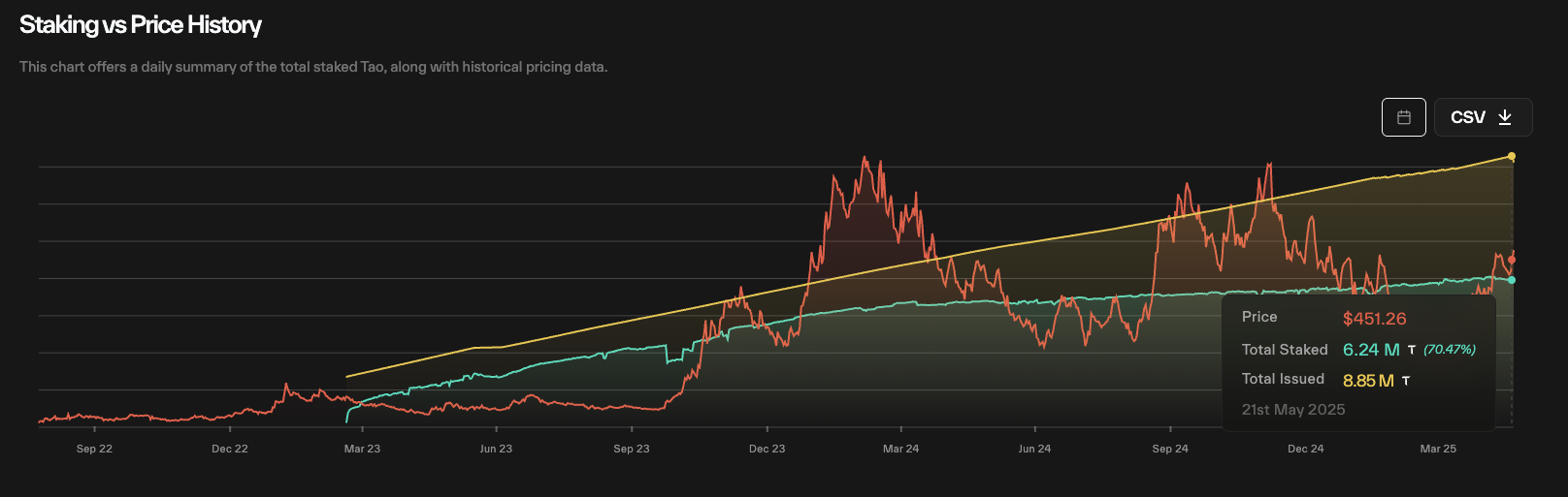 In May 2025, 70% of all issued TAO tokens were staked, showing that staking incentives are attractive and users have strong confidence in the token's performance. Compared to some of the other projects, Bittensor is among the ones with the highest staking ratio.