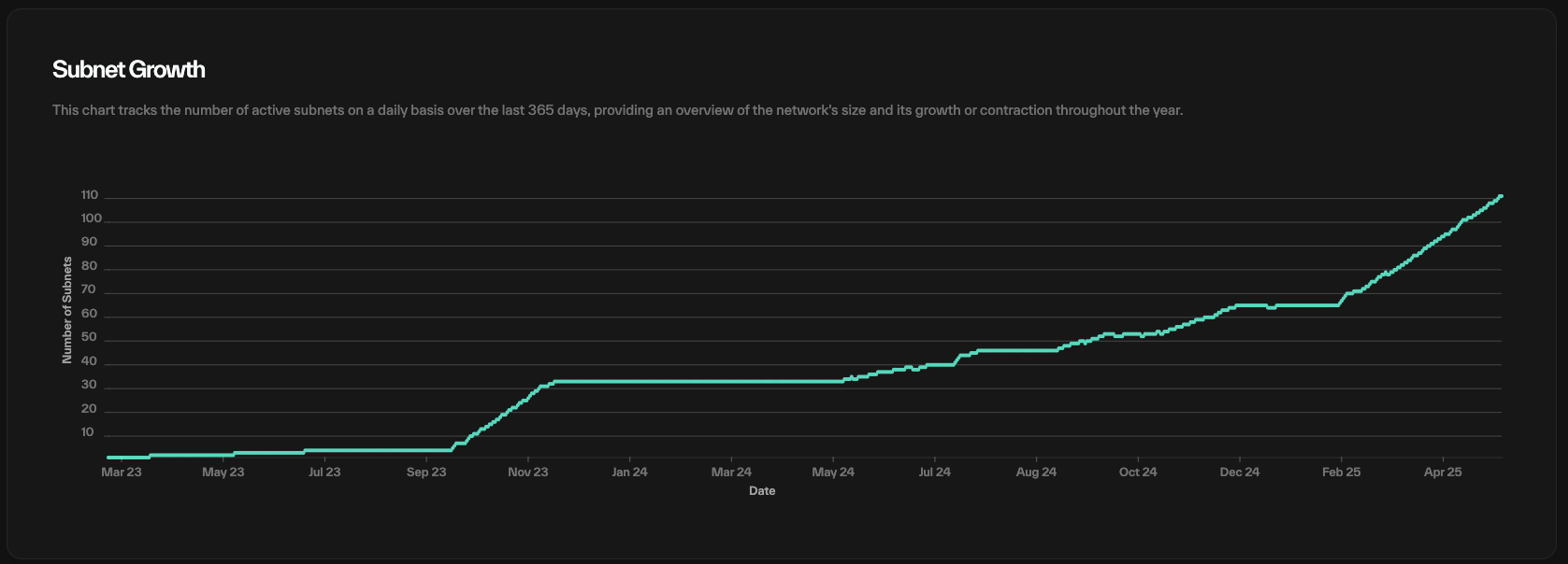 As shown in the chart below, the number of subnets grew rapidly in early 2025 after the Dynamic TAO upgrade.