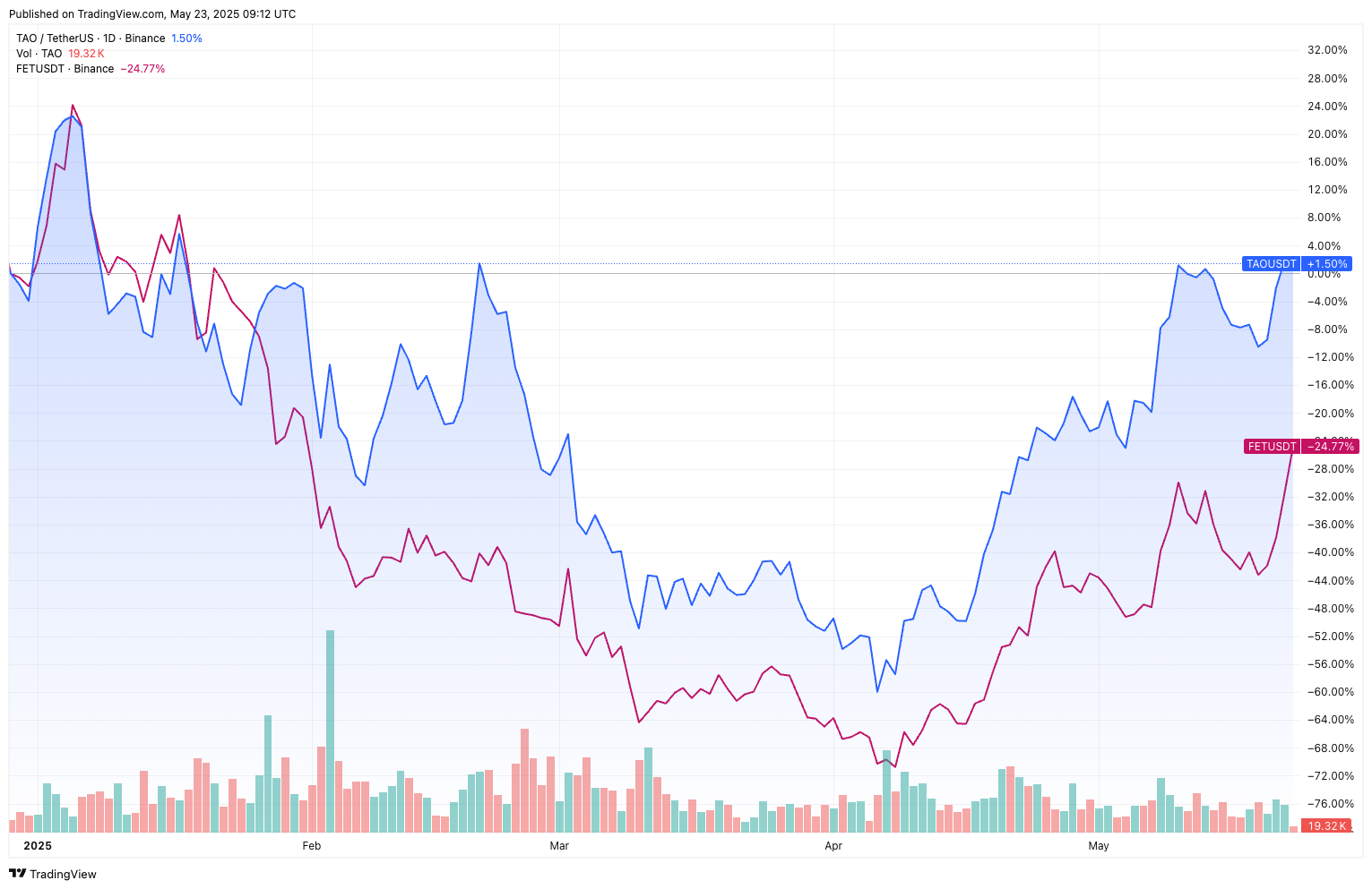 If we compare token prices from the end of 2024 to May 2025, TAO is nearly back to breakeven in percentage terms, while FET is down around 28%.Source: Tradingview
