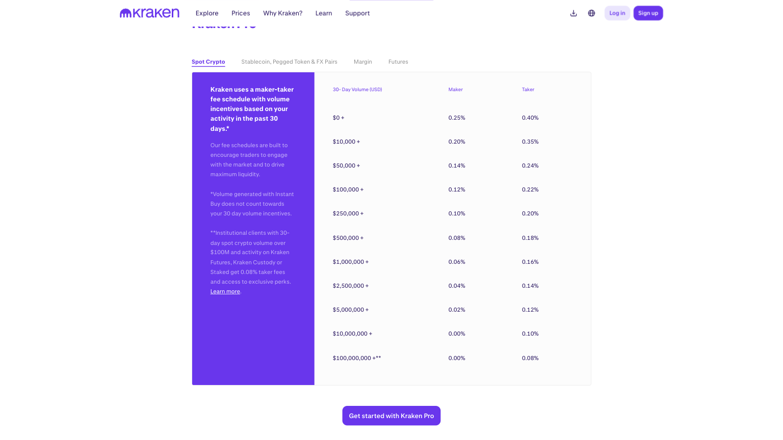 Kraken Pro's spot trading fees start at 0.25% for market makers and 0.40% for market takers. These rates are higher than the industry average. They're also significantly higher than market leader Binance's fees.